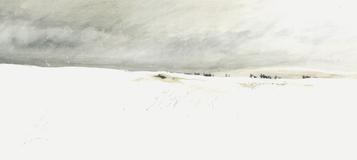 They Walked On Water • drybrush watercolor, 11 x 28" Imaginary landscape inspired by the story of the Morman journey of the Willie and Martin handcart companies.